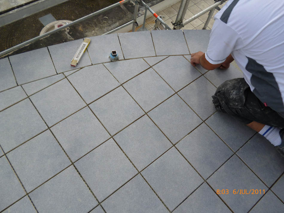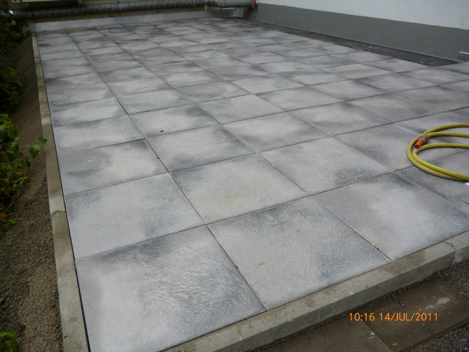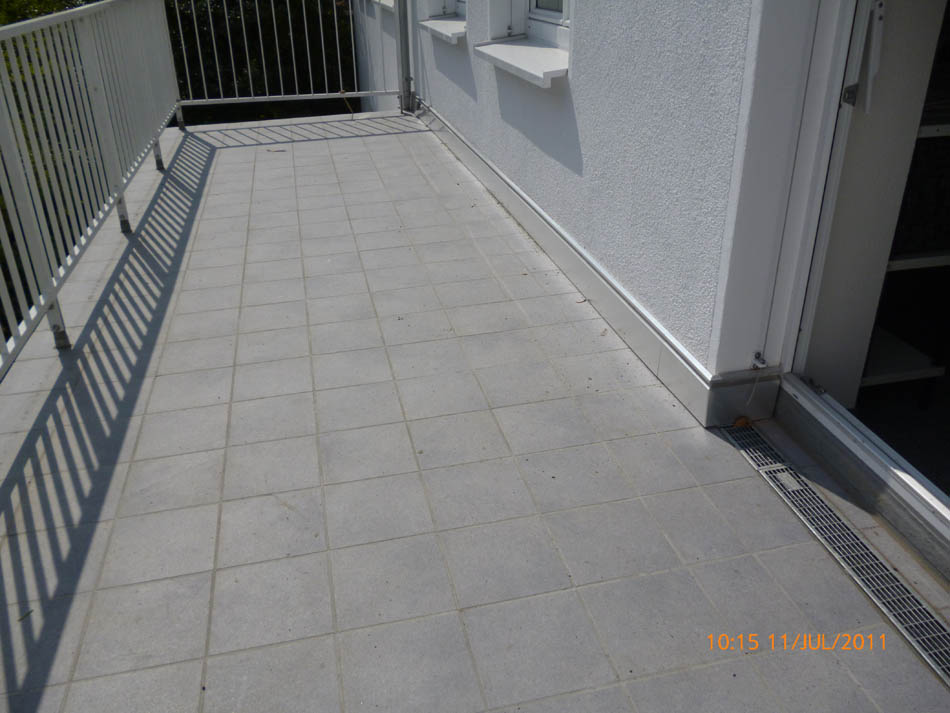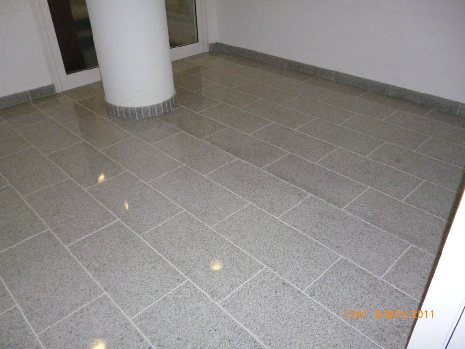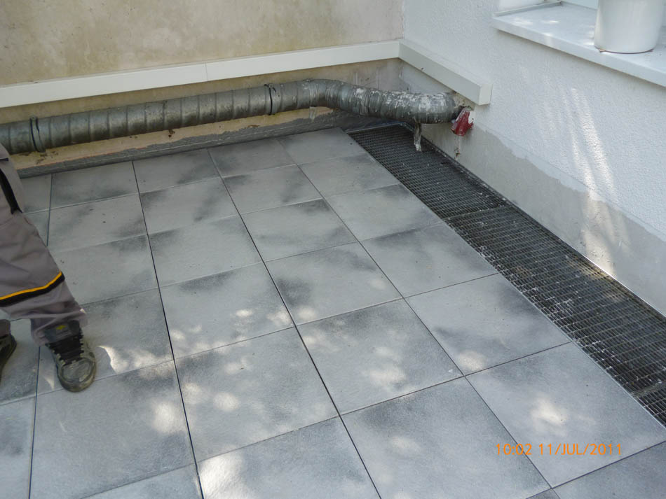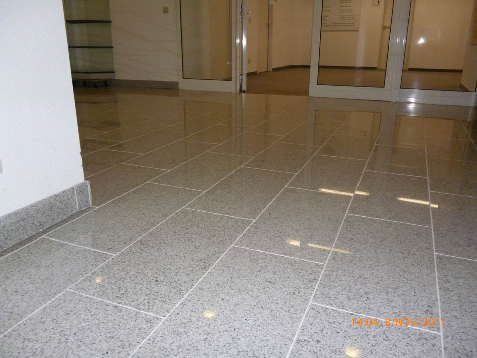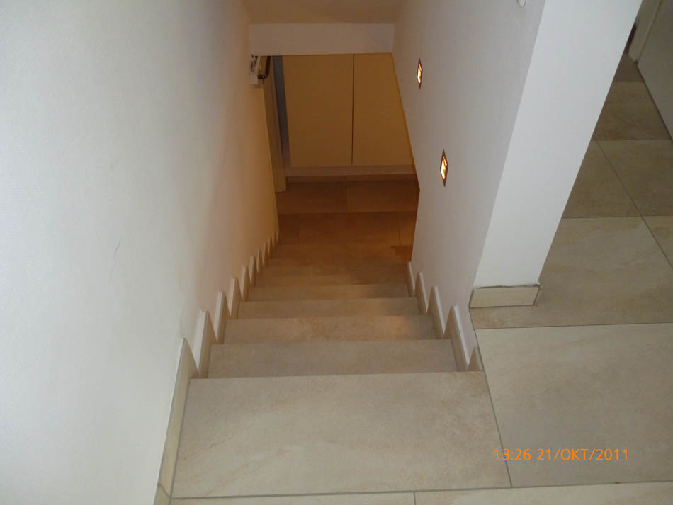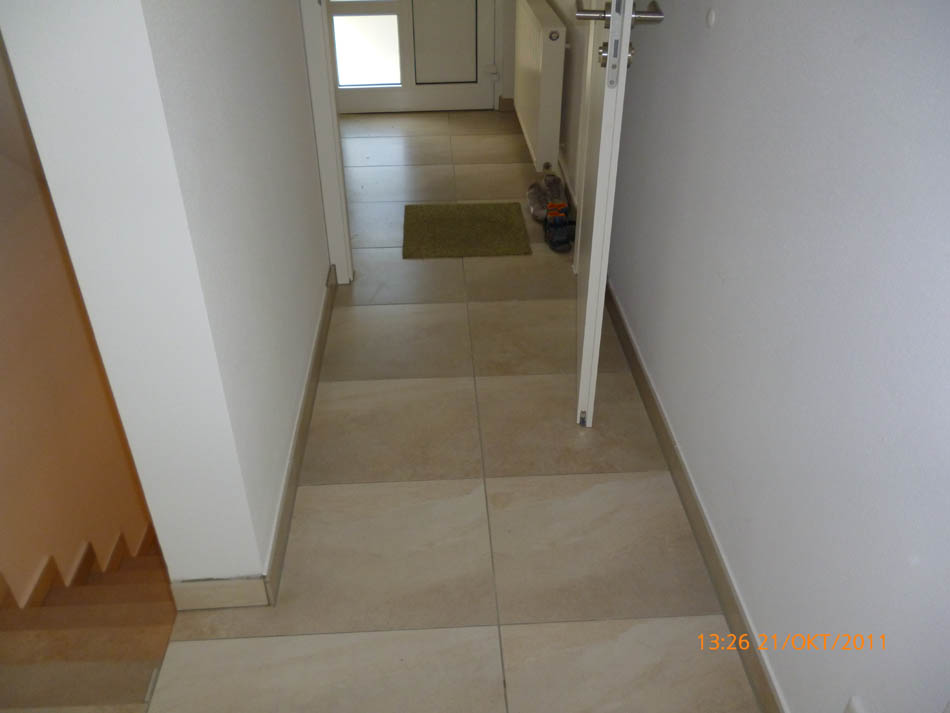 Durchgängig gefliester Wohnbereich - Eingelassener Holzofen mit Wandverkleidung aus Naturstein.